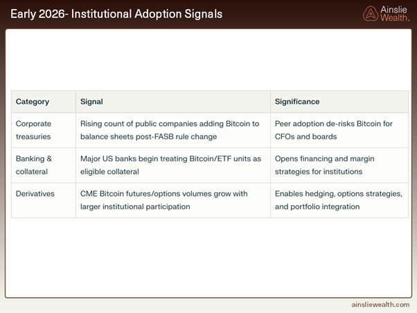 - Major US banks treating BTC / ETF units as eligible collateral: