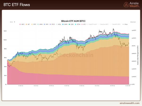 It’s obvious BTC ETF flows have cooled materially. The early surge in ETF demand has flattened out and, at the margin, even tipped slightly negative. However, when you consider the pullback in price and poor sentiment, what stands out is how little outright liquidation there has been. Investors have largely held their nerve, with total ETF AUM in BTC terms barely giving back any of the prior run-up, which speaks to positioning that is consolidating rather than capitulating.
