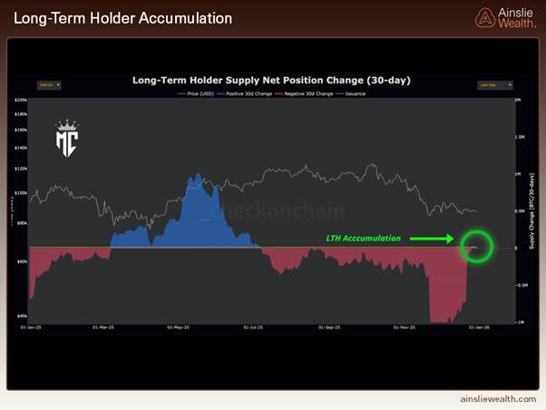 The same data, but zoomed in using net position change, shows that the trend has just started to turn. Historically, changes in long-term holder accumulation and distribution can persist for many months.