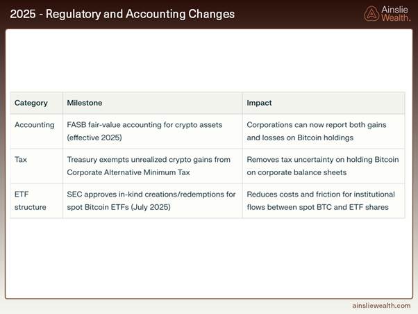 Clarifying that unrealised fair-value gains on Bitcoin do not get swept into the Corporate Alternative Minimum Tax removes the tail risk that treasuries would owe tax on paper gains every year. - • SEC approval of in-kind creations/redemptions for spot BTC ETFs: