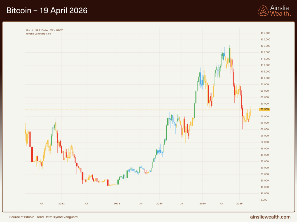 - Bitcoin recovered from US$67,000 to US$75,555 last week. Ainslie’s Chief Economist and Strategist Chris Tipper reads the bounce as mechanical, not structural.